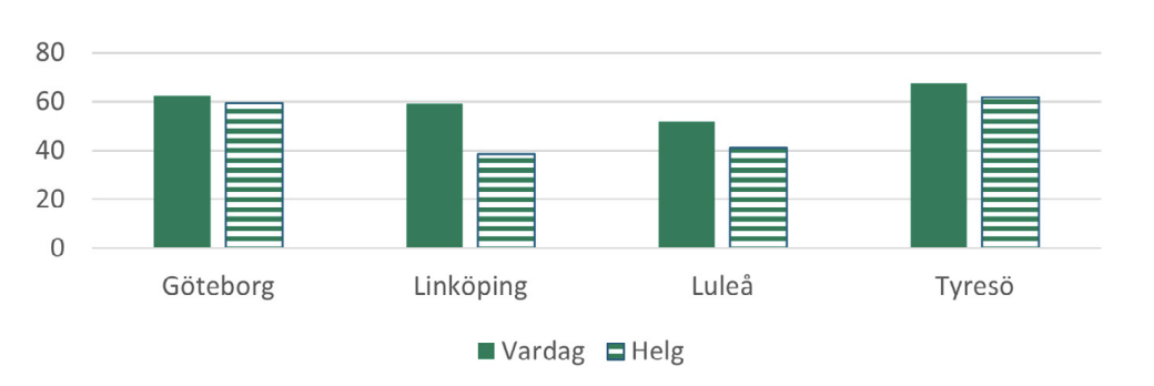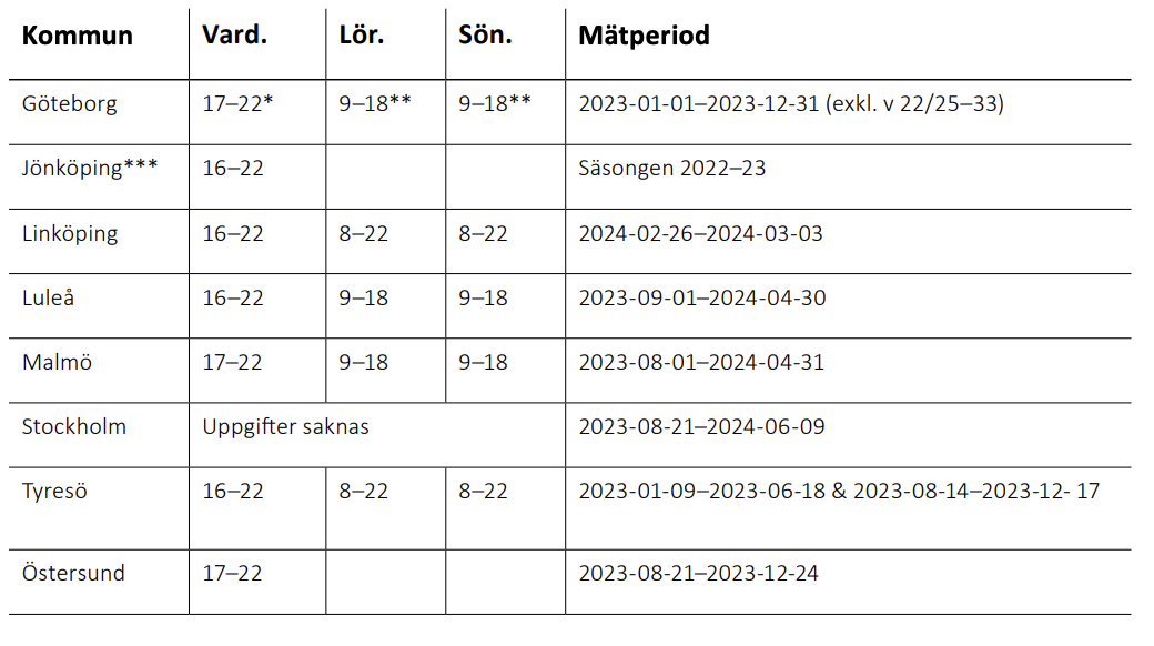 Bokningsgrad innebär här andel av den tillgängliga tiden som är bokad. Perioden som mäts varierar mellan olika kommuner, men ska återspegla en normal vecka. Även tidsspannet som lokalerna är tillgängliga för bokning varierar. I viss mån kan skillnader i mätperiod påverka resultatet och jämförelser mellan kommuner ska göras med försiktighet. Period och tidsspan för respektive kommun presenteras i tabell 4.
