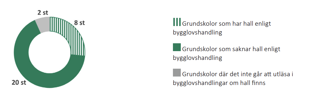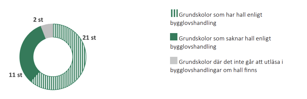 Analysen av de kommunala skolorna visar att 21 av 34 studerade skolor (62 procent) har en hall i byggnaden, men denna hall finns alltså inte tillgänglig för allmän bokning. Det här skulle kunna vara en outnyttjad potential. 11 kommunala skolorna saknar helt hall på sin fastighet. Merparten av dessa har dock en hall mycket nära, ofta på skolgården – men denna tillhör en annan fastighet. För 2 studerade skolor kan halltillgången inte utläsas i bygglovsritningarna.