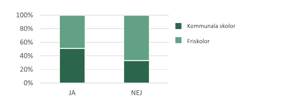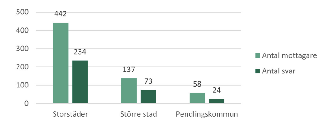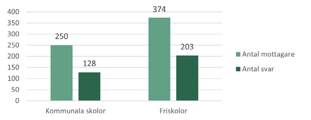 Totalt fanns 1 302 skolor i de 13 kommunerna. Den geografiska analysen identifierade 624 skolor som saknade bokningsbar hall och enkäten skickades därför till dessa. Vi fick 327 svar, vilket ger en svarsfrekvens på drygt 52 procent. Av mottagarna var 250 kommunala skolor och 374 friskolor. Mottagare och svarsfrekvens visas i figur 15 och figur 16.