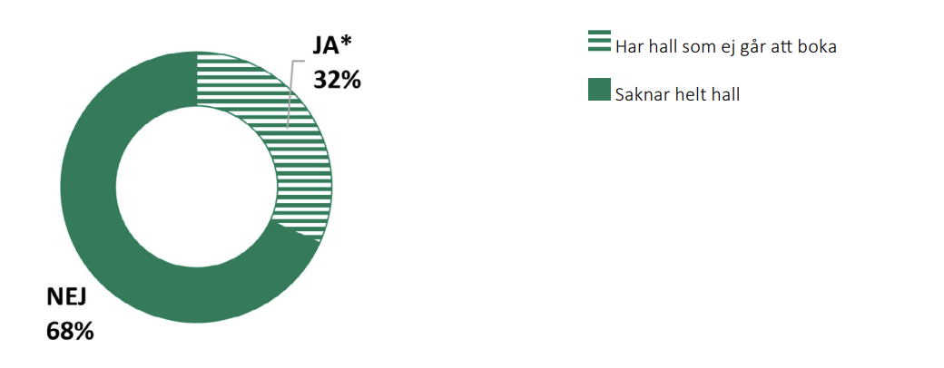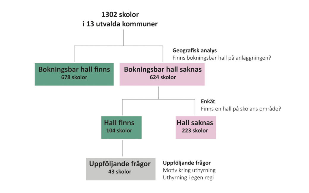 Analysen av geografiska data för hela landet visade att 39 procent av grundskolorna och 77 procent av gymnasieskolorna inte har en bokningsbar hall på skolans fastighet. Den geografiska analysen svarar dock inte på om skolorna helt saknar hall, eller om de har en hall men inte hyr ut den. För att kunna svara på den frågan skickade vi en enkät till samtliga skolor i de 13 fokuskommunerna som enligt analysen saknar bokningsbar hall på sin fastighet.