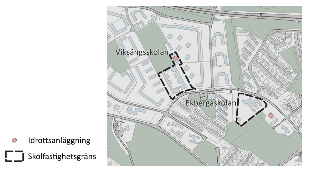 Syftet med analysen är att dels identifiera anläggningar som hör till skolor, dels att identifiera skolor som har en bokningsbar idrottsanläggning. Här antar vi att en anläggning som ligger på en fastighet där det ligger en skola, också används inom skolverksamheten. Det kan sannolikt förekomma enstaka fall när anläggningen används av en annan verksamhet än den som använder skolbyggnaden.