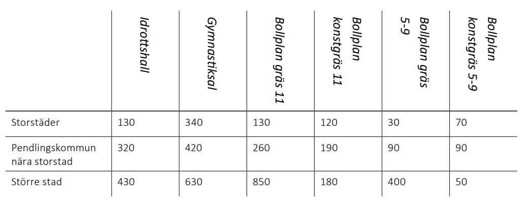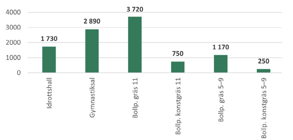 Information om bokningsbara anläggningar kommer från Riksidrottsförbundet som gjort en omfattande nationell kartläggning av idrottsanläggningar. I den här utredningen använder vi två huvudkategorier av anläggningar: bollplaner och hallar. I underlaget representeras dessa geografiskt som punkter. Riksidrottsförbundets kartläggning är den mest heltäckande information som finns tillgänglig. Inom ramen för den här utredningen har vi gjort en granskning för ett urval av kommuner. Granskningen har bestått i att jämföra Riksidrottsförbundets geodata med geodata från kommunala register. Felaktigheterna som identifierades bedöms vara så små att de inte har betydelse för slutsatserna i den här utredningen.