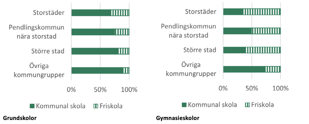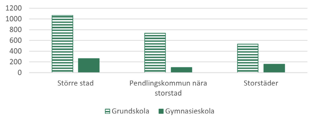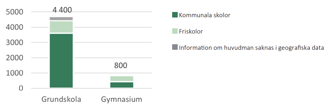 Först identifierar vi ”skolfastigheter”. Det gör vi genom att välja ut fastighetsområden som sammanfaller med skolpunkter. I vissa fall återfinns skolor på mycket stora fastigheter som täcker även till exempel gator och parker. I de fallen används istället ett område på 200 meters radie kring skolpunkten som ”skolfastighet”. För varje yta beräknas antal skolpunkter efter huvudman och skolform (grundskola eller gymnasium).