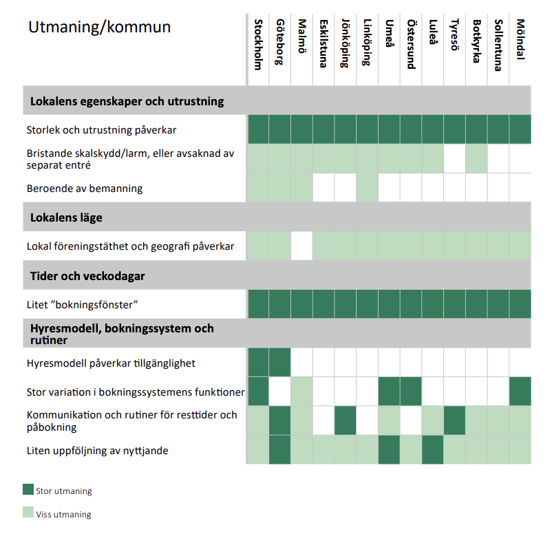 Tabell 5. Sammanfattande tabell över hur kommunerna uppfattar de olika identifierade utmaningarna för bokning och nyttjande.