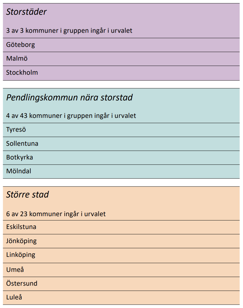 Två av delstudierna fokuserar på ett urval av 13 kommuner. Urvalet av enskilda kommuner baseras på en önskan om en represenation från de tre kommungrupperna, en geografisk spridning i landet samt kommunernas tillgång till bokningsdata. Eftersom frågan om anläggningsbrist bedömts vara mest aktuell för storstäder bestämdes att samtliga storstadskommuner skulle ingå. De ingående 13 kommunerna presenteras i tabell 1.