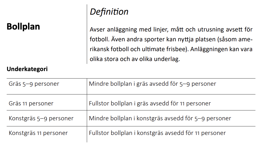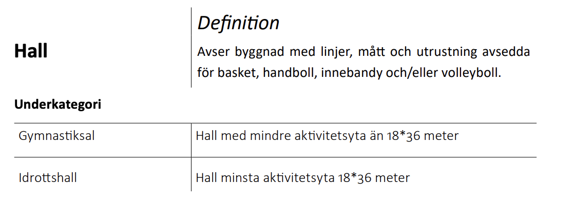 Tabell 2. Definitioner av ingående idrottsanläggningar, baserat på Riksidrottsförbundet.