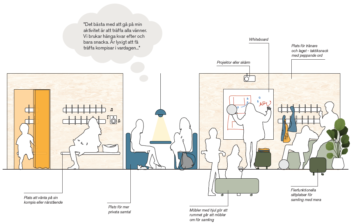 Omklädningsrummet ska inte bara vara en funktion, det ska också kunna vara en plats för umgänge för de som vill. Det ökar lusten att vara där, och med det följer ett engagemang i att hålla rummet rent och snyggt.