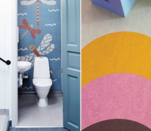 Konstnärlig utsmyckning i toalett, ger identitet och karaktär.