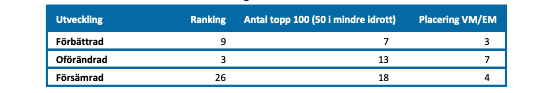 Utöver detta visade analysen på också ett urval av idrotter, där världsrankingen inte speglar det aktuella landslagets slagstyrka på ett adekvat sätt. Därför användes i stället placering i VM eller EM som ett prestationsmått. Av 14 analyserade idrotter hade tre utvecklats i positiv riktning, medan fyra backat och sju presterat på samma nivå som tio år tidigare. Tabell 1 visar sammantaget att den svenska toppidrotten inte var lika stark 2019 som den var 2009, samt att toppen blivit smalare. 19
