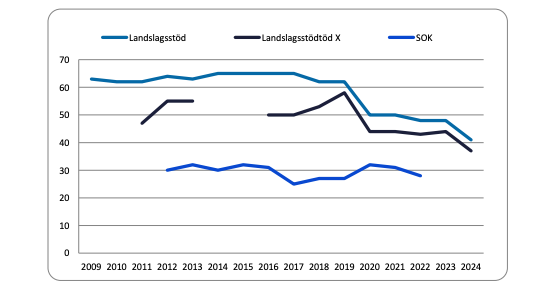 Sverige är med andra ord annorlunda på minst två sätt jämfört med de länder och system vi redogjort för här. I Sverige sysslar alla tre organisationerna i fråga med stöd till idrottslig verksamhet, och stödet till elitidrotten sprids ut på många fler idrotter än i de övriga länderna. Under 2022–2023 tog 50 SF och många fler idrotter del av elitidrottsstödet. I det preliminära arbetet inför 2024–2025 har siffran däremot sjunkit något, vilket den gjort för varje år sedan 2017 och besluten att samordna elitidrottsstödet, som återspeglas i Figur 3. Sedan det preliminära beslutet om fördelning av elitidrottsstödet 2024–2025 fattades har vissa förändringar skett. Dessa beskrivs längre fram i texten. Det som i Figur 3 betecknas Landslagsstöd X har förekommit i några olika skepnader genom åren. 2011–2013 betecknades stödet Riktat stöd och syftade till att ge individer och lag ett specifikt stöd mot världstoppen. Stödet försvann helt under 2014–2015, för att sedan återkomma som ett projektstöd i landslagsverksamheten 2017–2019. Därefter omvandlades stödet till ett extra landslagsstöd, baserat på specialidrottsförbundens uttryckta behov och formulerade utvecklingsplaner.