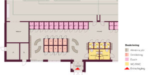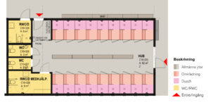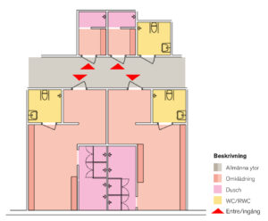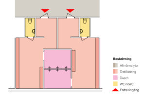• Möjlighet till ombyte och dusch i wc inne i omklädningsrummet. Vanligtvis sker det genom att utforma wc tillgängligt (ett mervärde i sig) samt installera dusch där.
