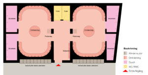 Figur 12. Illustration som visar ett öppet omklädningsrum med bås, Carlstedt arkitekter.