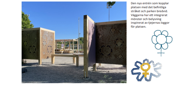 Process: I workshoppar samarbetade vi som landskapsarkitekter med en grupp tjejer för att stärka känslan av tillhörighet och trygghet på platsen. Tjejerna uttryckte bland annat en oro att killar skulle ta över platsen. För att motverka detta har tjejerna varit måna om att skapa en plats som blir väl omhändertagen, bland annat genom att inkludera blomsterplanteringar. Ett annat inspel från tjejerna var loggan som de skissade fram, vilken kom att bli i form av en kombinerad blomma och kvinnosymbol. De såg loggan som en symbol för platsen.