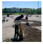 Tjejerna hjälper till att så ängsfrön i de ytor som skapades genom att bryta upp den befintliga asfalten.