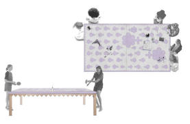 Bord med mönster baserat på tjejernas identitet för platsen. Bordet är dimensionerat som ett pingisbord för att bjuda in till fler aktiviteter beroende på besökarens behov.