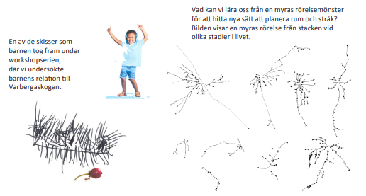 Process: ÖrebroBostäder önskade att en strategi för skyltars utformning skulle tas fram genom en medskapande process. Utmaningen har varit att anpassa strategin efter den mångfald av målgrupper som besöker Varbergaskogen. I tillägg var ambitionen att skyltningen skulle väcka nyfikenhet och bidra till att stärka platsens identitet. I projektet hade vi workshoppar med barn från den lokala skolan, och under en av dessa utforskade vi hur barnen uppfattade sin miljö genom att de fick föreställa sig att de var myror. För att bredda perspektivet på vad rörelse är och kan vara fick barnen fundera på hur de skulle röra sig genom området om de var en myra. Med hjälp av material som de hittade på plats, rep och varandra tolkade de, och lekte sig fram till, hur en myra lever och beter sig. Utifrån sina egna förmågor, fantasier och relationer till skogen formade de nya rumsligheter. Vi kunde observera vad barnen fastnade för och hur de valde att röra sig i området när de inte behövde följa de givna vägar som de är vana vid. Genom att använda och prata om det sinnliga runt omkring sig började de ta in de små detaljerna som småkryp, ett barr eller ett löv. Genom att leka sig in i en myras perspektiv tog de sig an miljön på ett helt nytt sätt och gav på så vis oss nycklar till att utveckla alternativa affordances – sådana som vuxenvärlden helt enkelt inte lägger märke till eller har glömt bort.