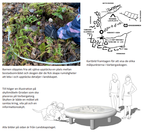 Resultat: Utifrån barnens fantasier och förhållningssätt till platser i skogen, designade vi en serie skyltmöbler som påminner om platser man hittar inne i skogen. Till grund för konceptet med skyltmöblerna låg materialet från workshopparna med barnen och kompletterande underlag från dialoger med andra i området. Skyltmöblerna används beroende på individens behov som en informativ skylt, en möbel eller ett objekt för lek och häng. Tillsammans bildar de en igenkännbarhet genom området, men de fungerar också som enskilda objekt att samlas kring. Skyltmöblerna är robusta och har en tydlig identitet genom material eller detaljer som återkommer i varje struktur.