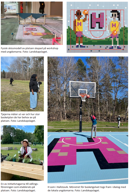 Resultat: Etapp 1 omfattar en basketplan som togs fram tillsammans med lokala basketintresserade ungdomar samt ett område med odlingsbäddar. De kommande etapperna kommer bestå av fler ytor som uppmuntrar till olika typer av idrott och rörelse. De olika delarna ska kopplas ihop genom platsbyggda rum för vila och umgänge samt ytor som innehåller lösa delar, som till exempel byggklossar, för att kunna experimentera fram olika typer av rörelse och bygga lekstrukturer med. Detta skapar en flexibilitet kring vad ytan blir i relation till vem som är där och hur hen väljer att använda den. Tillsammans läggs en grogrund för att skapa det som ovan beskrivs som ”platsbalett”, en miljö där olika människors vägar korsas och där vanor och beteenden blir till en ”vardaglig dans”.
