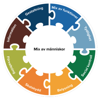 Genom att arbeta med de åtta aspekter som beskrivs ovan på en plats ges förutsättningar för en mix av människor. En mix av människor är viktigt för tryggheten, så att eventuella problemgrupper inte så lätt tar över kontrollen i rummet. För att ett område ska vara fritt från grupper som stör ordningen eller begår brott behövs en mix av människor som kan utöva en indirekt social kontroll (se avsnittet Social Kontroll).30