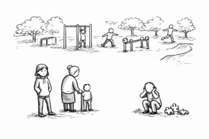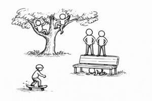 Hur vi rör oss beror både på våra egna förmågor och på vad platsen ”bjuder in till” – det som ibland kallas affordances. En bänk kan vara vila för en vuxen, lek för ett barn och träningsredskap för en motionär. Ett staket kan upplevas högt för ett barn men lågt för en vuxen. Platsen och kroppen samverkar alltid – och tillsammans avgör de vilka rörelser som känns möjliga.